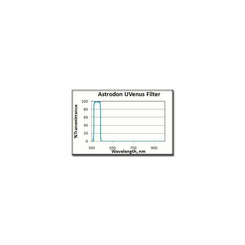 A UV filter is needed to photograph the clouds on Venus which blocks wavelengths above 400nm completely. Astrodon makes the best filters on the market for this. An interference filter, it has a higher transmission than the UVBRI glass filter set often previously used. The Astrodon filter also blocks the infrared. Cheaper filters often let IR through, which can lead to reduced contrast and blurring of the planet’s edge. The UV-pass filter has filter threads and hence fits into standard eyepiece barrels and camera adapters. To achieve optimal results, a reflecting telescope and UV-sensitive black-and-white camera are required – such as the DMK. Refractors and colour cameras typically give poor results.