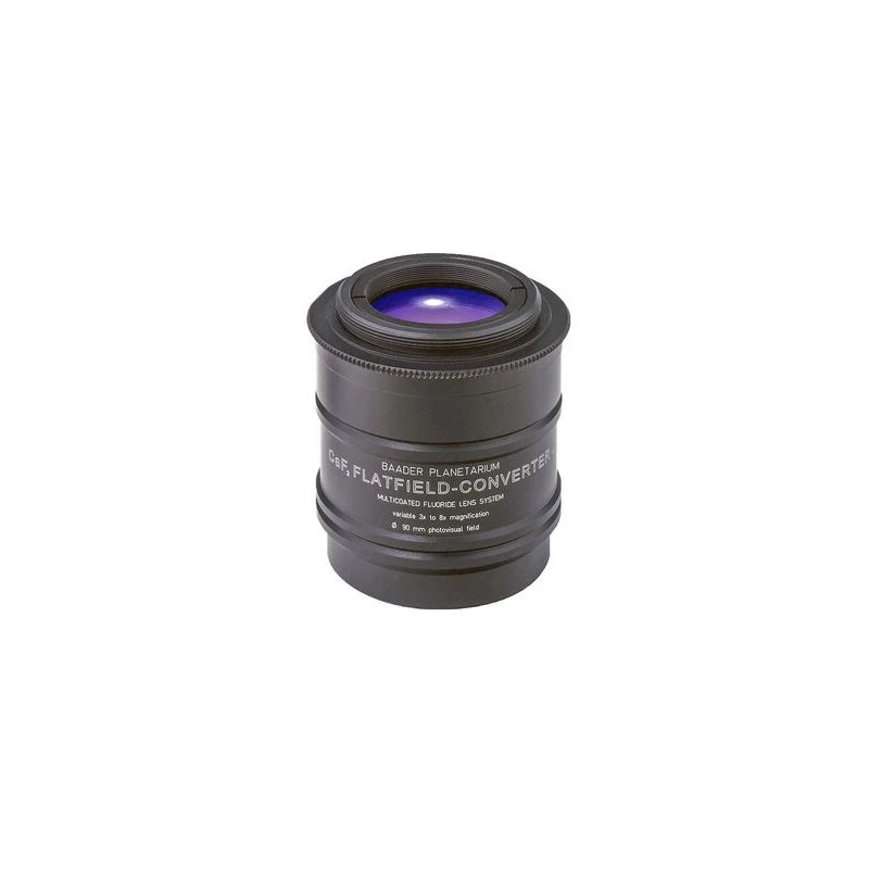 The multiplying factor can be adjusted between 3X and 8X, depending on the projection distance used. The design focuses on the four times increase in the focal length. A completely sharp image is available at a 90mm image size. The on-axis sharpness, also at extensions of 15X, is only limited by the optics of the telescope itself.
