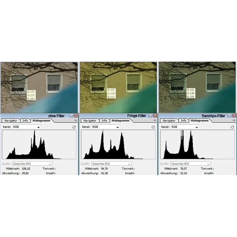 The semi-apo filter blocks more than 25% in blue and red light. The proportion is lower in green, but about 30% of light is lost across the entire spectrum. But the colours are once again neutral, except for a slight green tint. The light reducing effect of the semi-apo filter is about half a stop.