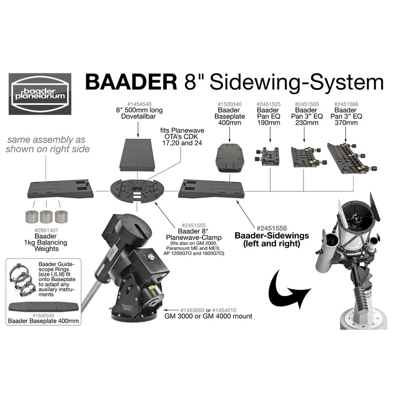 Baader-Sidewings get adapted on the side (left, both sides or right) of the 8″ Planewave Clamp Baader Planewave-Clamp 8″.