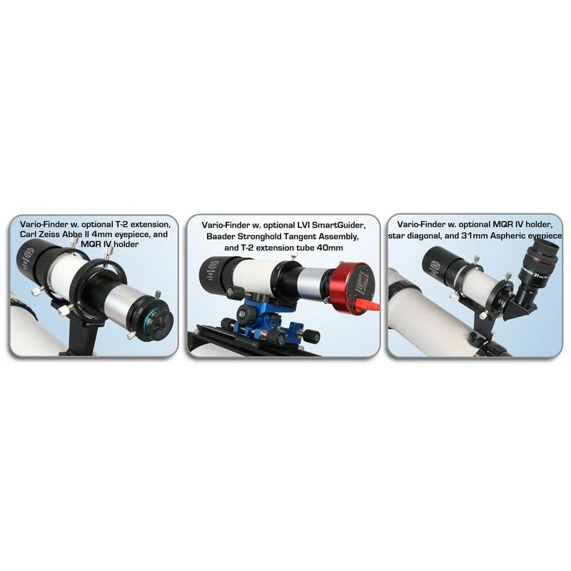 The Vario Finder is extremely versatile, offering numerous possibilities for the adaptation of accessories. Standard astronomy eyepieces can be used with the 1.25 inch connection. The 1.25 inch Amici prism can be used to enjoy excellent nature watching. It also provides comfortable astronomical observing. The finder set also includes a 25mm eyepiece with an illuminated reticule. The T-2 thread also allows connection to other T-2 accessories.