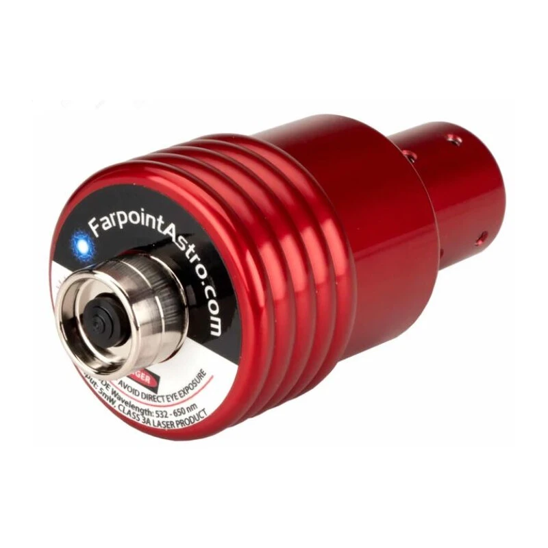 - Farpoint 650nm Laser Collimator is precisely machined from a single piece of aluminum in a single machining step, resulting in perfect alignment. Offering the smallest aperture of any other laser in the amateur astronomy market, Farpoint lasers feature an aperture (0.76mm or 30/1000 of an inch) producing less speckling and more precise reading of the laser beam’s position on the telescope mirror. Features a 1.25″ and 2″ combo stepped barrel, an extra bright 650nm red laser, and superior EIGHT screw alignment arrangement ensuring that BOTH ends of the laser diode are held in place by two sets of directly opposing screws for precise and lasting alignment.