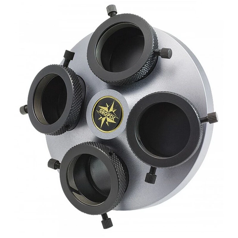 The eyepiece turret makes it possible to mount several eyepieces at once. The desired eyepiece can be brought into line with the focuser on the telescope by simply rotating the turret. This eliminates the inserting and removal of the eyepieces and the need for somewhere to temporarily storage them. The turret can also be used to take a camera in one of its eyepiece sockets.