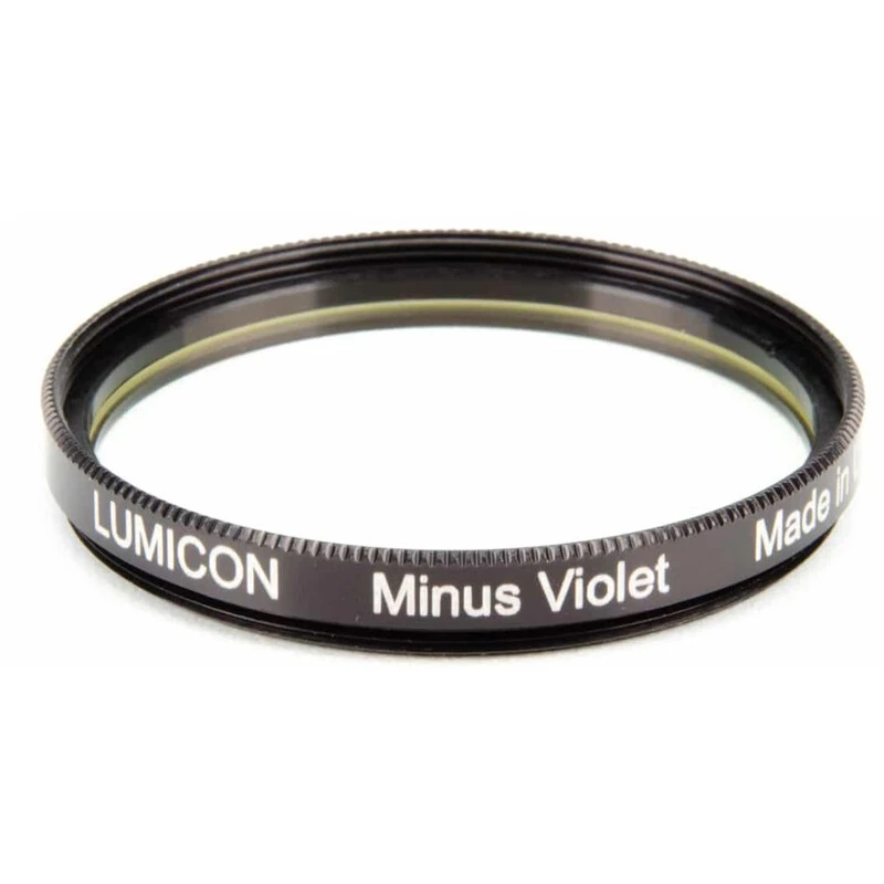The Lumicon Minus Violet Filter greatly improves photographs taken through lens systems, producing pinpoint star images. It is especially recommended for all telephoto lenses. The Minus Violet filter passes the maximum amount of visible light, including the full blue, green, yellow and red portions of the spectrum. It absorbs violet and ultraviolet light below 420nm, thus eliminating blue halos around bright stars in color photography. In B&W photography it eliminates bloated and swollen star images caused by violet and ultraviolet light, which telephoto lenses cannot focus perfectly, due to chromatic aberration. This filter is unsurpassed in photographic performance.
