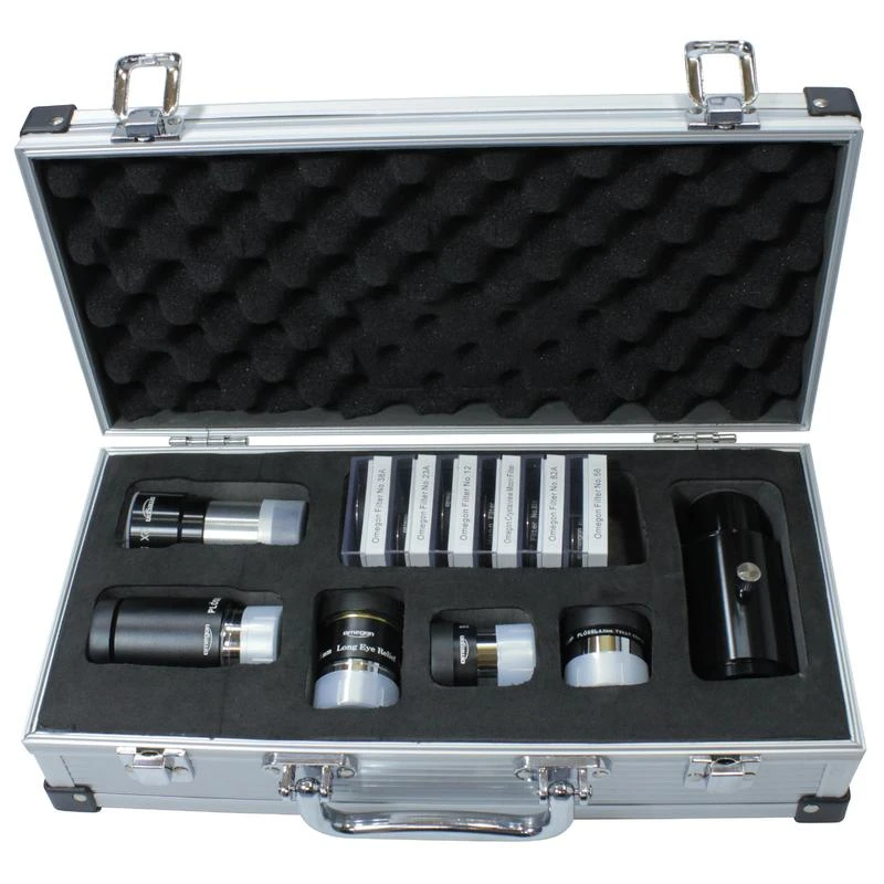 Every telescope needs accessories for worthwhile observing. The big Omegon case provides you with an easy start in the world of accessories. You do not need to worry about eyepieces, filters, or Barlow lenses. Simply reach for this starter pack for your first observing sessions, allowing you to concentrate on what the real fascination is – the observing itself.