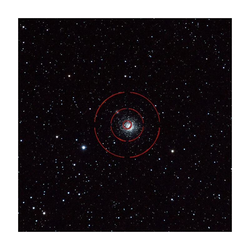 How do you find objects in the sky? You have a star chart in your hand and you are trying to find an object that you cannot see. Here the Radiant target circles help you. The inner circle covers an area of 0.5 degrees, the middle circle 1 degree, and the outer circle 2 degrees.