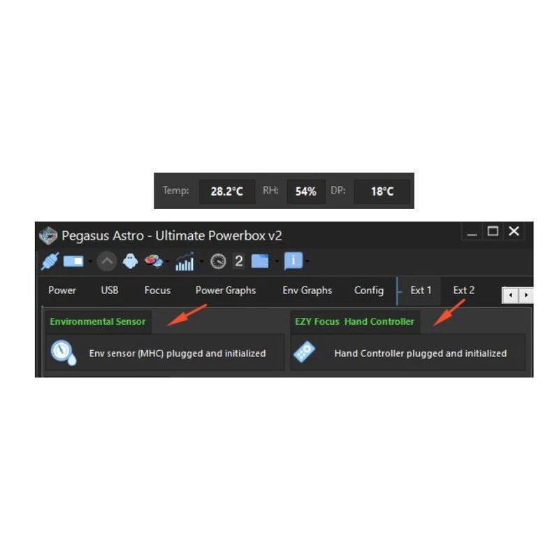 EZY Focus has an embedded high accuracy temperature and relative humidity sensor. The Ultimate Powerbox v2 automatically uses this sensor discarding the stock UPBv2 sensor.
