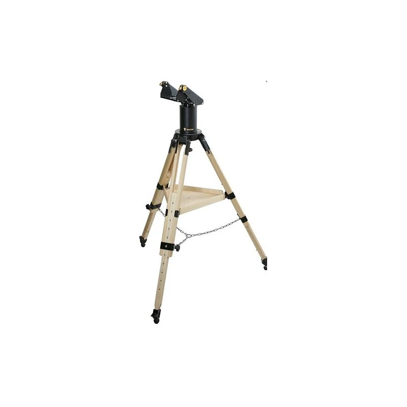 Leg extensions raise the altitude axis to 5-feet and scale-on-leg extensions allow repeatable setting to the desired height. A wood accessory tray ties the legs together for rigidity. Built-in pier allows for high-altitude viewing. A bubble-level is integrated into the tripod base. Metal ground spikes with rubber tips are provided.