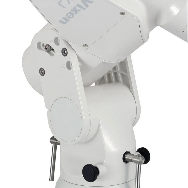 - The mount head: the AXJ mount head consists of a scratch-resistant anodized aluminum plate. There are threaded holes (M8 x8, 5/16″ x4) on the mounting head to enable prism clamps even from other manufacturers to be attached. In the accessories section you can find suitable installation options from Vixen: use Vixen Prism clamp for a simple telescope connection or Vixen AXD attachment plate, if you want to mount two optics (e.g. a guiding scope) in parallel.